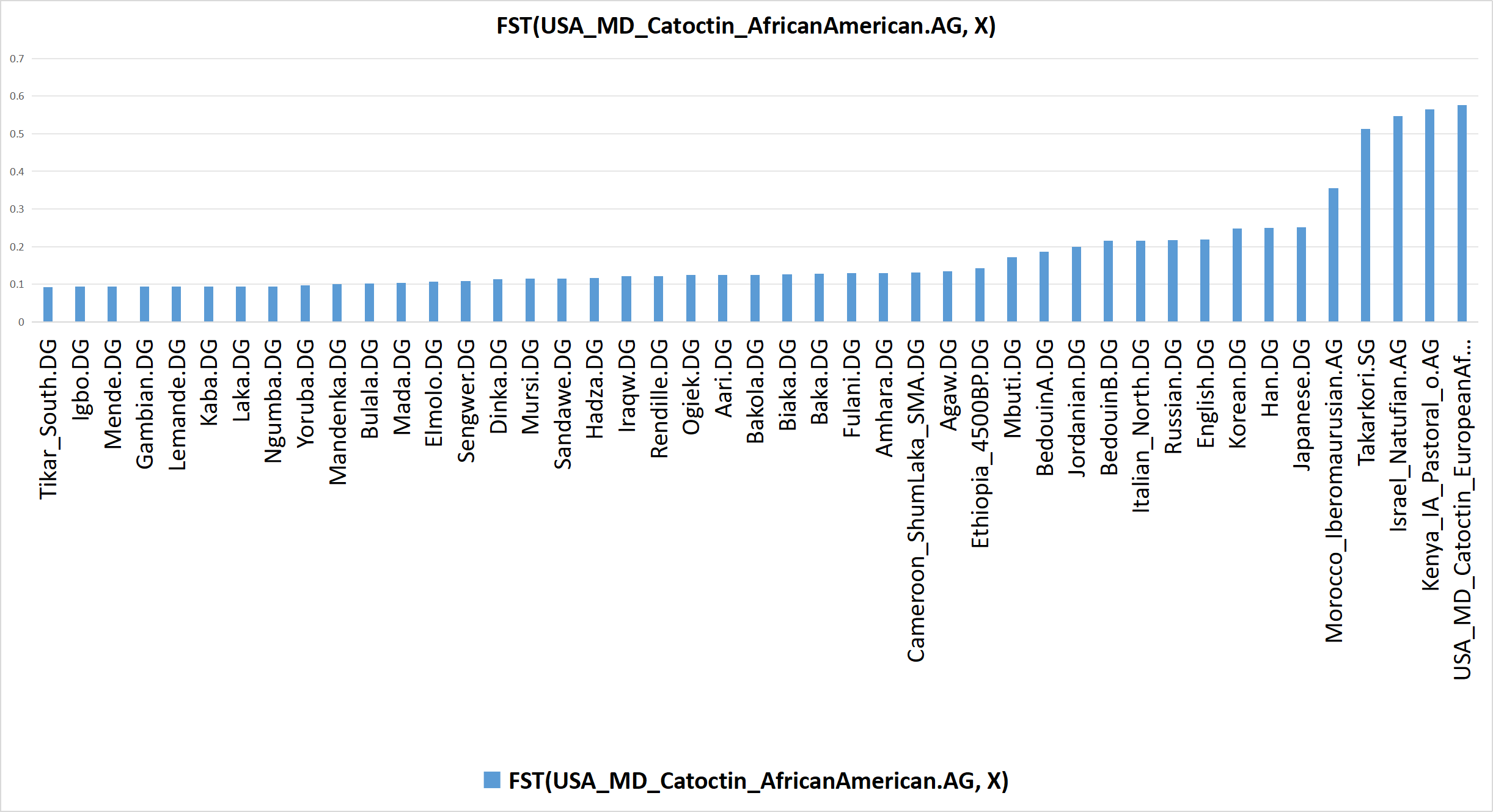 Consider the following bar graph of FST(USA_MD_Catoctin_AfricanAmerican.AG, X). An FST (fixation index) value corresponds to the total genetic difference between two populations across a selected set of genetic markers, such as SNPs (single nucleotide polymorphisms); therefore, the larger an FST value is, the more different two populations are; this is opposite of f-statistics, in which the larger an f-statistic is, the more genetic drift that two populations share.
