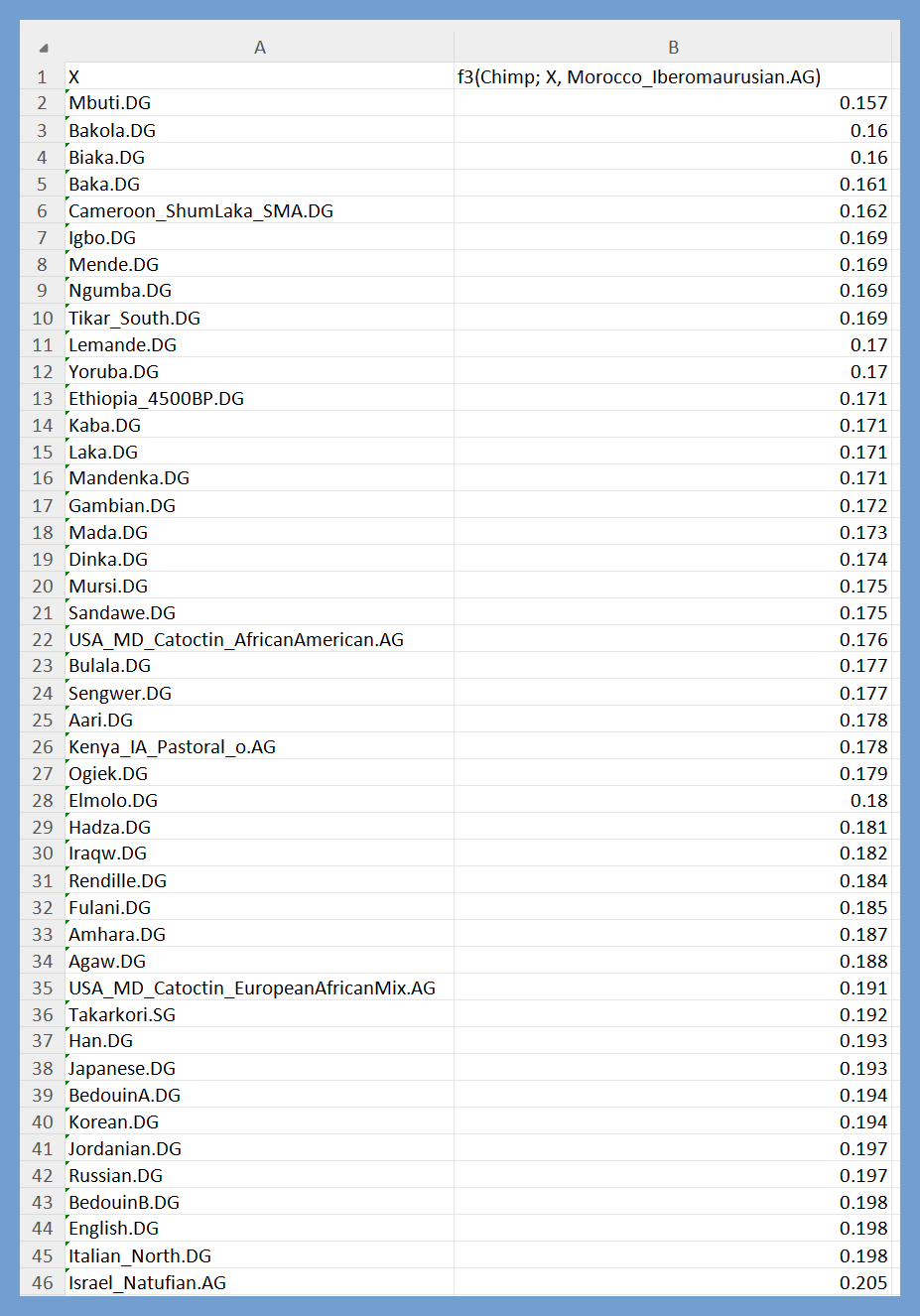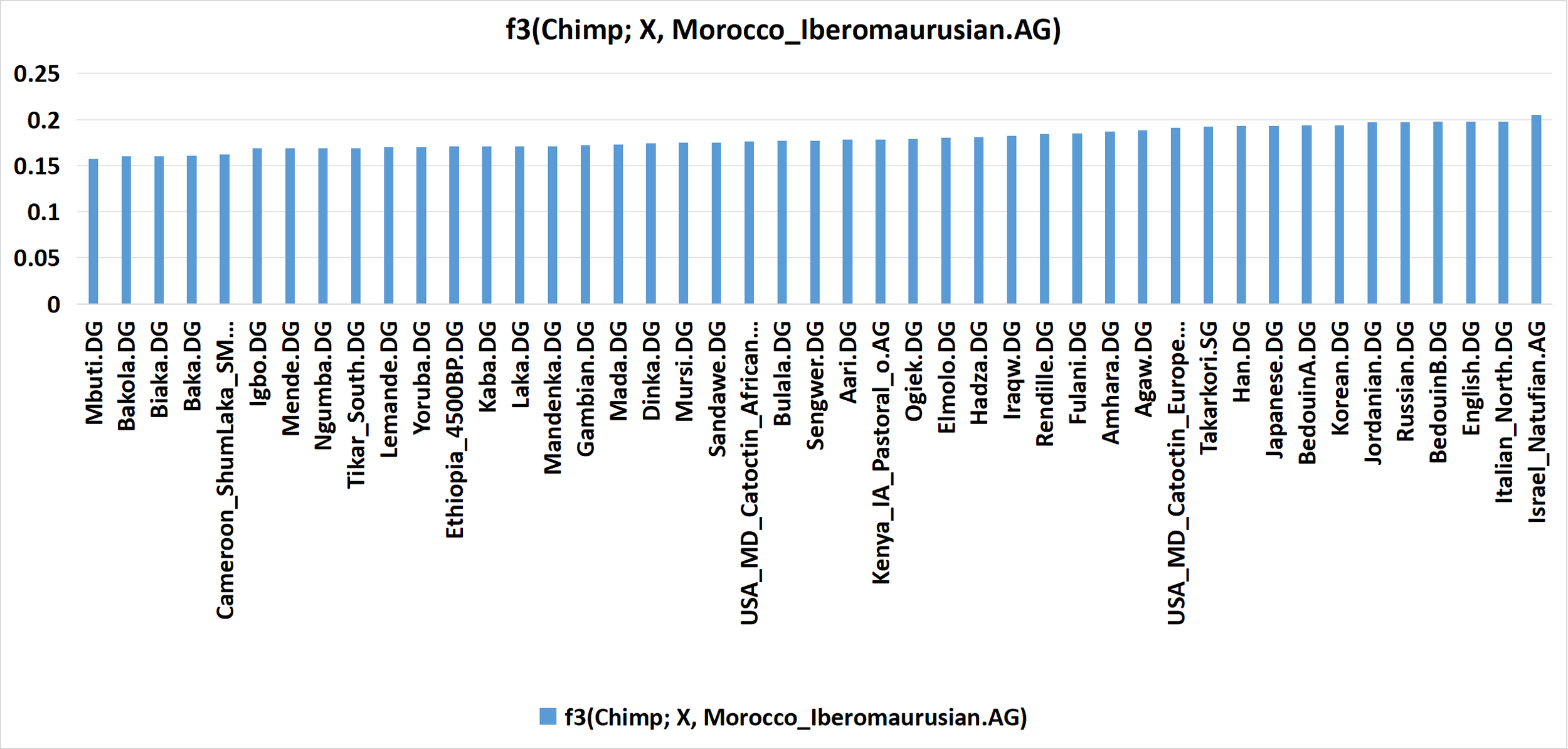 f3(Chimp; X, Morocco_Iberomaurusian.AG) in tabulated form. Notice that the values that correspond to X = Sub-Saharan African population are not significantly lower than those that correspond to X = Takarkori.SG. For example, f3 = 0.17 when X = Yoruba.DG, which is ~88.5% of the value for X =Takarkori.SG (0.192). This indicates that ~88.5% of the genetic drift that’s shared by Takarkori.SG and Morocco_Iberomaurusian.AG is also shared by Yoruba.DG.