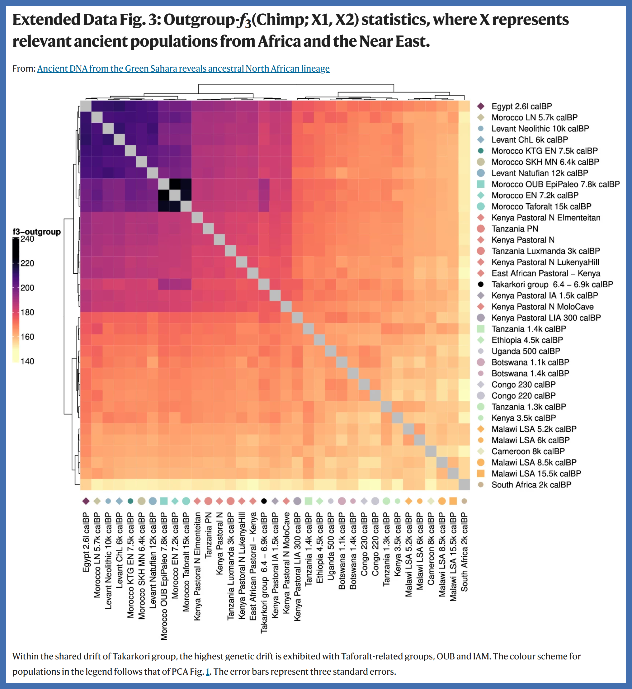 Extended Data Figure 3 of Salem et al (2025), which is a representation of f3(Chimp; X1, X2). The darker that a square is, the higher that the corresponding f3 value is. As can be seen, the squares that correspond to f3(Chimp; Takarkori group, [Morocco Taforalt | Morocco EN | Morocco OUB EpiPaleo]) are darker than any other value of f3(Chimp; Takarkori group, X2), which indicates that the Takarkori pastoralists share the most drift with Morocco Taforalt, Morocco EN, and Morocco OUB EpiPaleo - all three of which are Iberomaurusian.