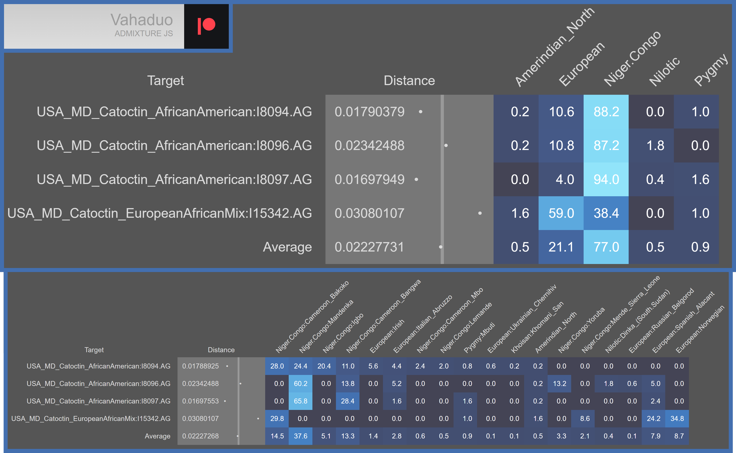 Ancestry models of African Americans who partly comprise USA_MD_Catoctin_AfricanAmerican.AG, and that of the individual who comprises USA_MD_Cactoctin_EuropeanMix.AG. Note that the African American individuals are modelled overwhelmingly as Niger-Congo. These models were generated via Vahaduo Admixture calculator.