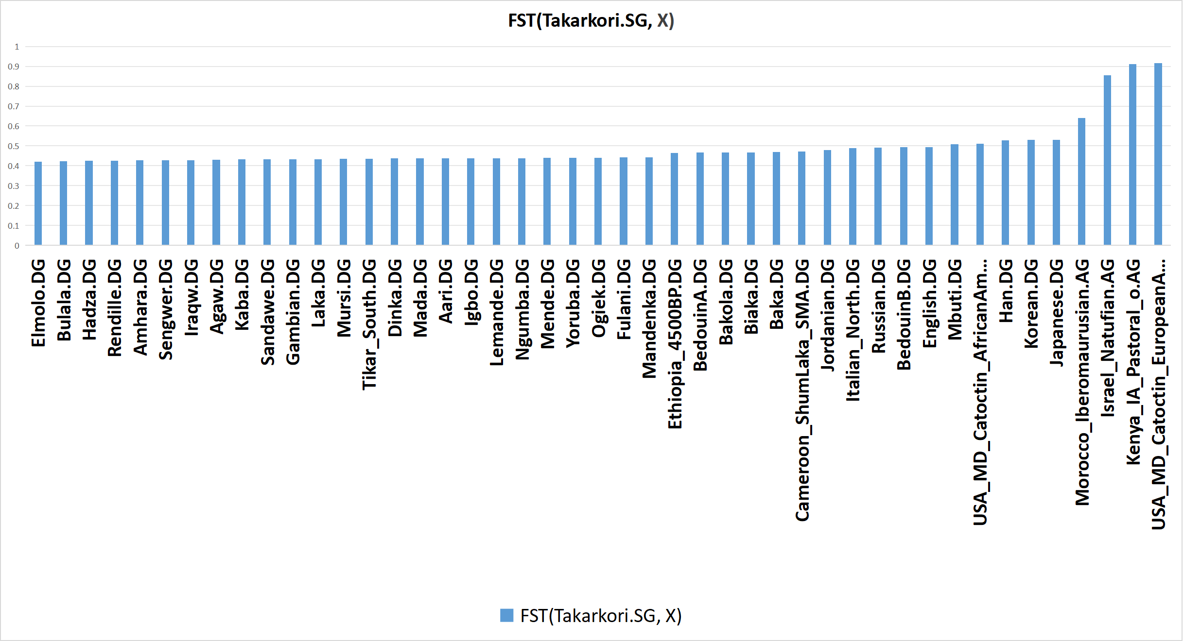 Bar graph of FST(Takarkori.SG, X), based on calculations computed by AdmixTools 2 using Version 62 of the AADR [Allen Ancient DNA Resource] (and appended populations). Click here to see the input & output data in AdmixTools 2 that was used to produce this bar graph.