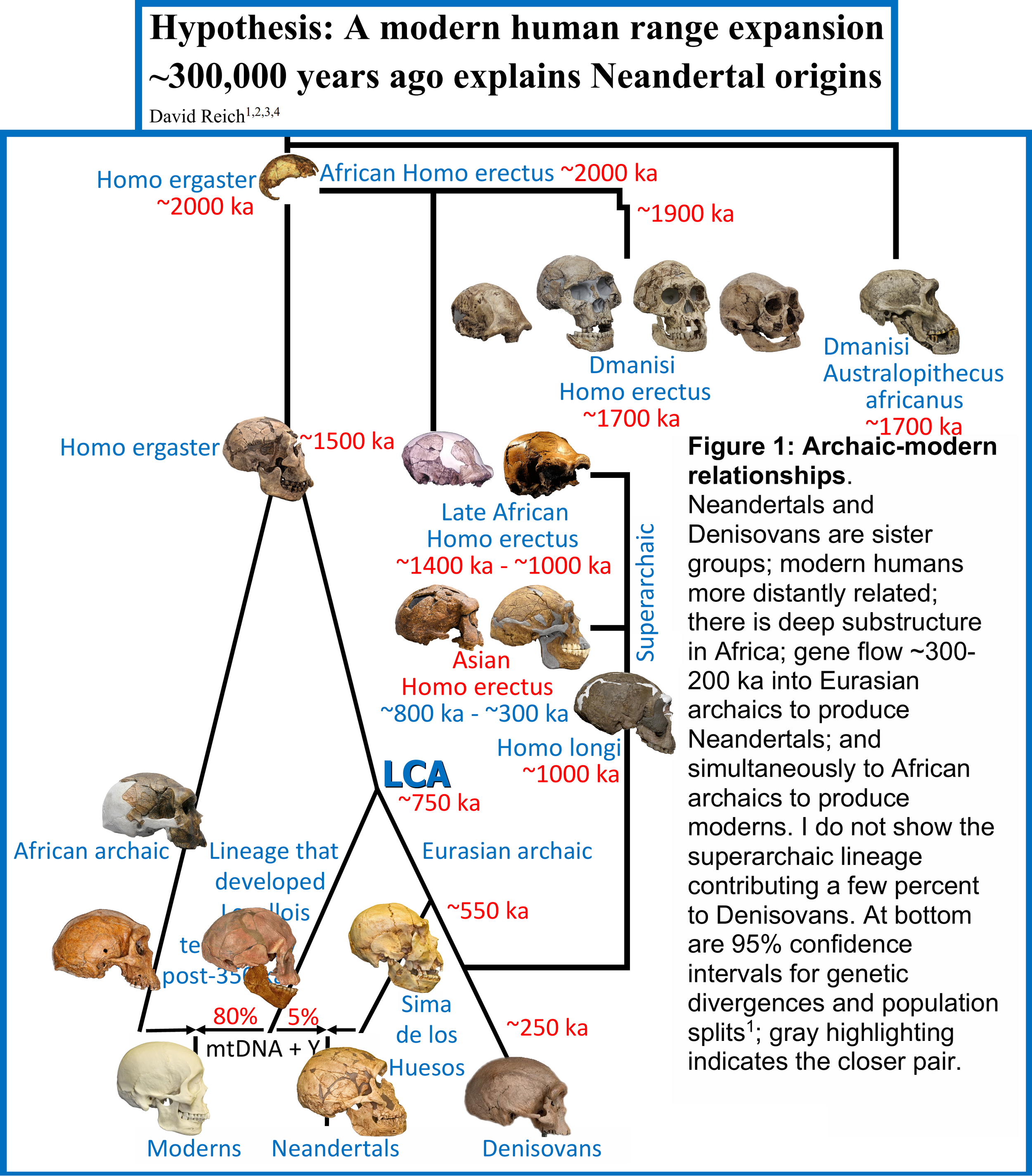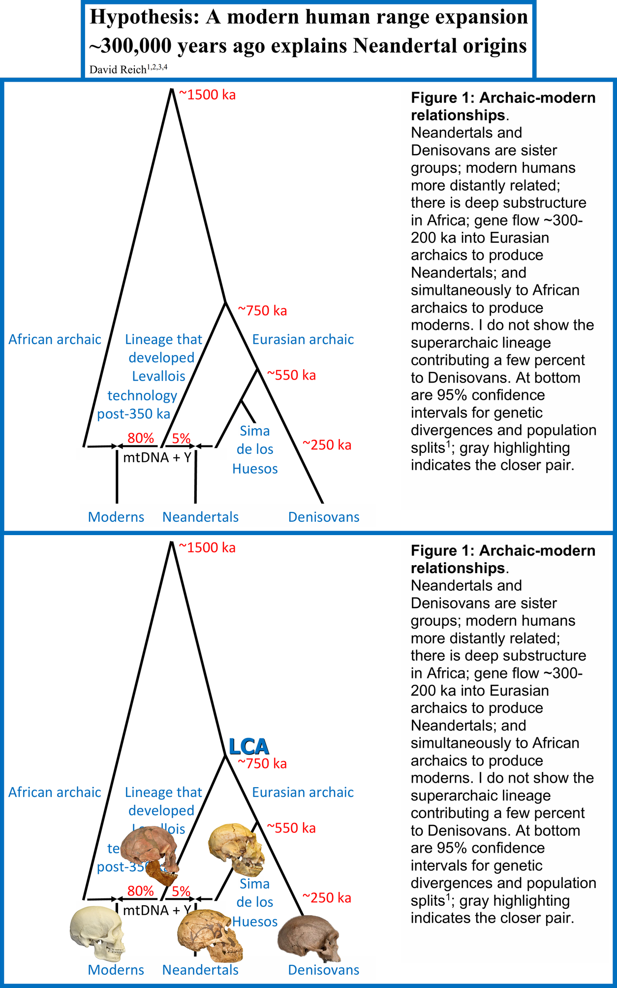 Figure 1 of Reich’s article is shown below, alongside an edited version of it; the latter includes an additional label (“LCA”) and images of fossils to help visualize the morphological differences between the included populations. As can be seen, the original figure features a node named Eurasian archaic that leads to Sima de los Huesos and Denisovans.