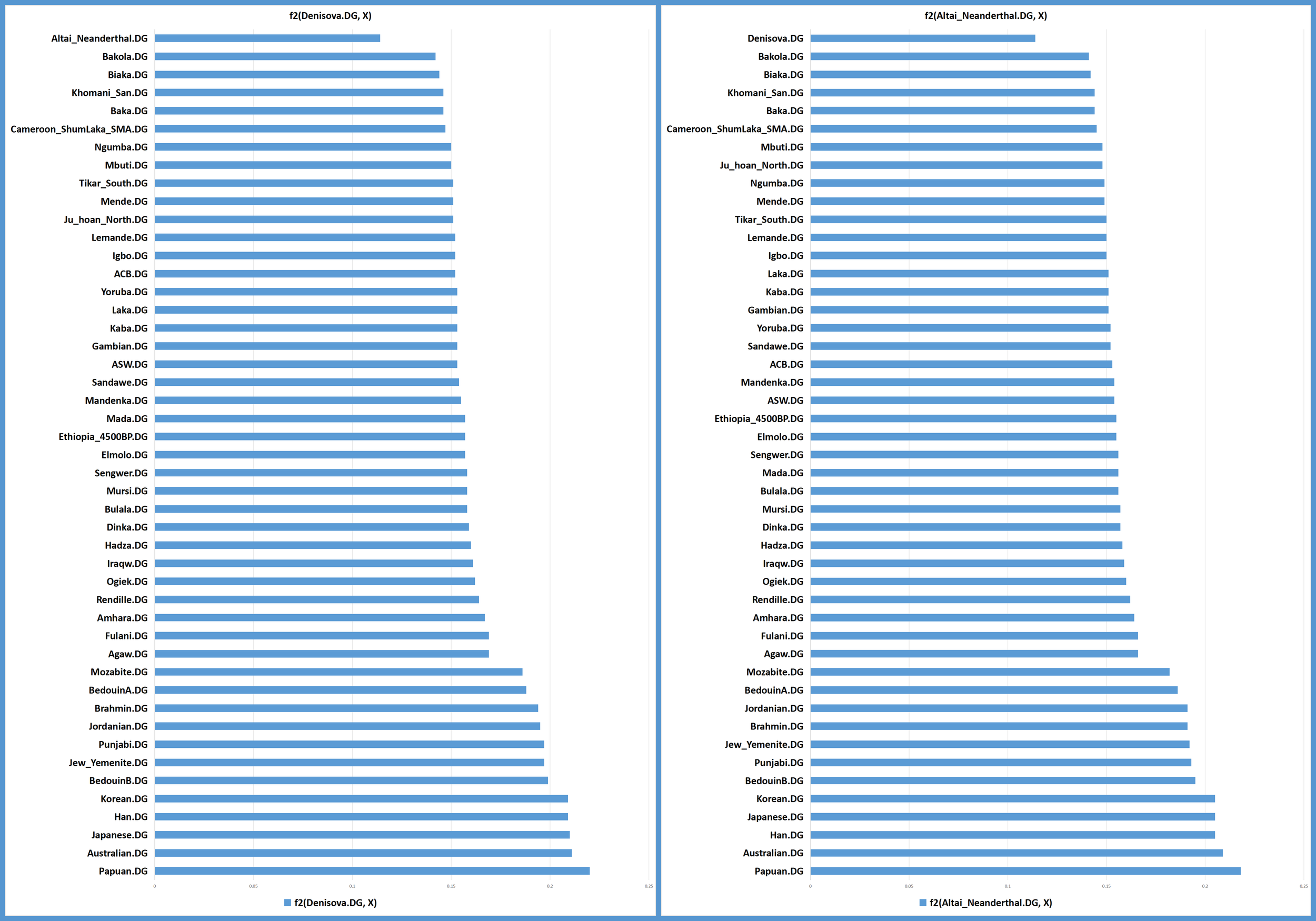 F2 statistics measure the genetic distance between two populations, whereby a smaller value equals a smaller genetic distance. These two bar graphs of f2 statistics clearly indicate that Denisovans and Neanderthals are closer to each other than they are to various Homo sapiens populations; they are based on calculations made via AdmixTools 2.0 that can be seen here.