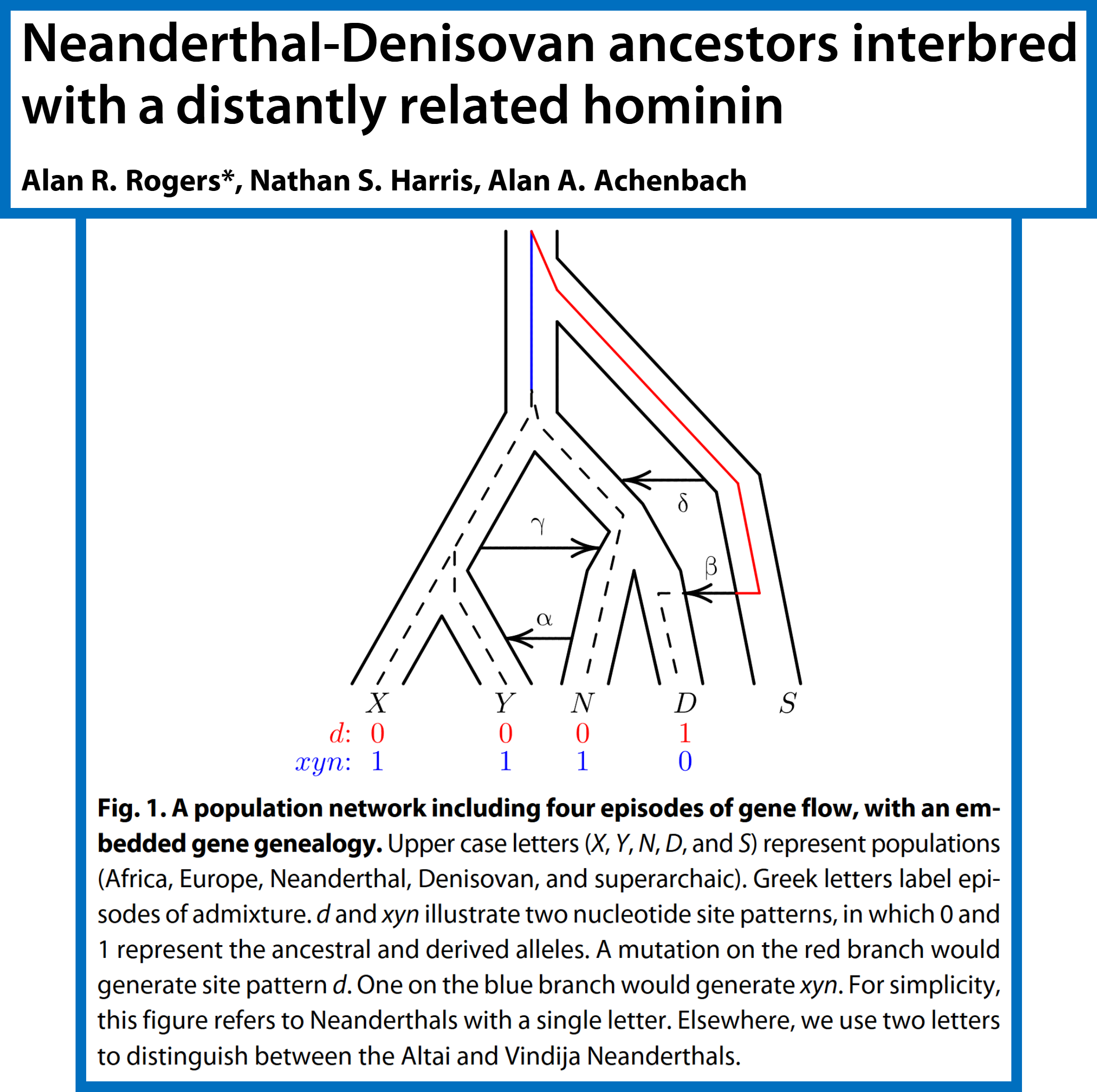 Such admixture events are explained in the peer-reviewed article, Neanderthal-Denisovan ancestors interbred with a distantly related hominin (2020) [link]. The lead author of this article is Alan R. Rogers of University of Utah’s Department of Anthropology, so the authors of the article will be referred to herein as Rogers et al.