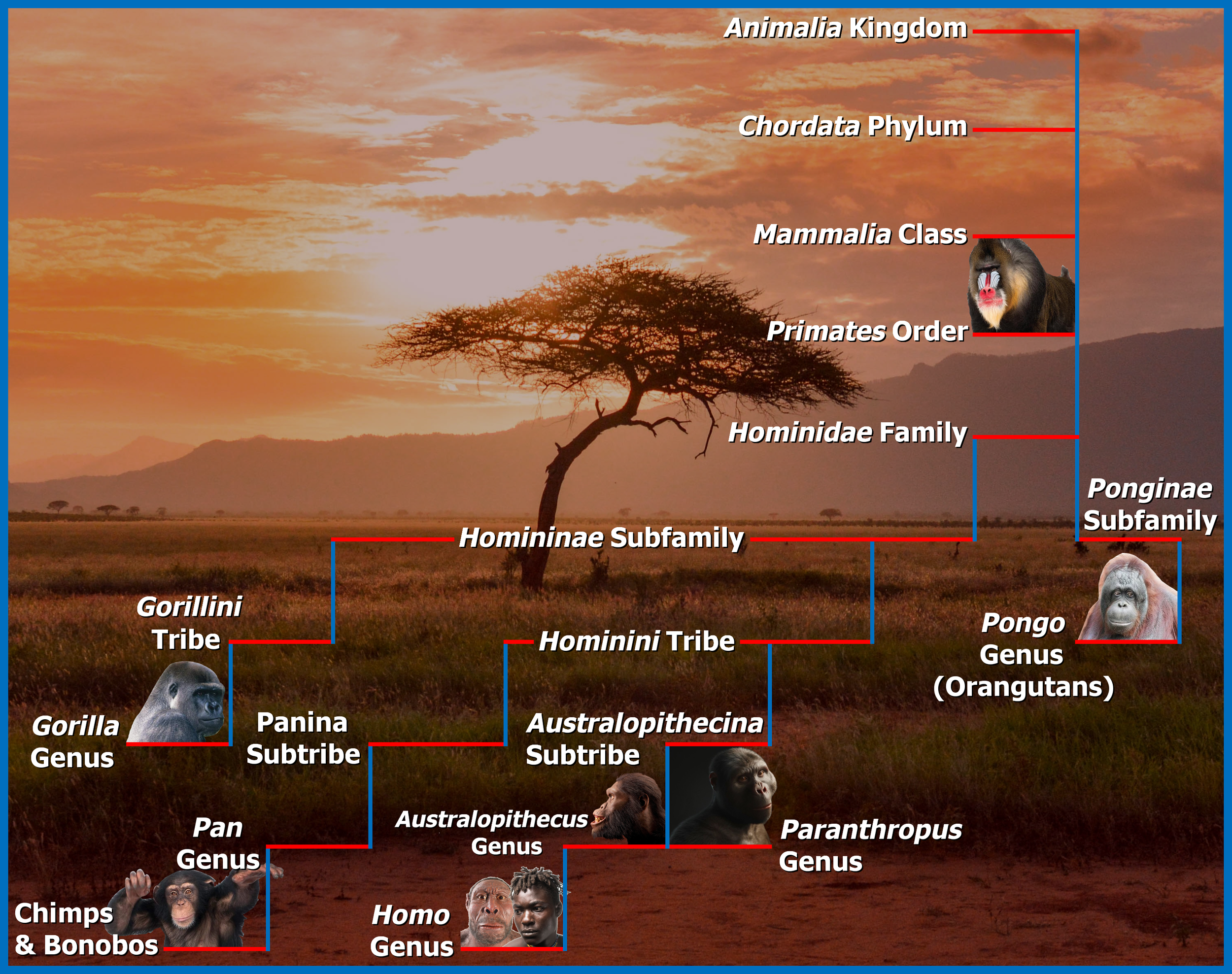 Homo belongs to the subtribe Australopithecina (aka Hominina), which split from the subtribe of Chimpanzees and Bonobos (i.e. Panina) ~7 million years ago; the lineage of gorillas split a few million years earlier, and that of orangutans split even earlier. Australopithecina includes the genera (plural of genus) Australopithecus and Paranthropus - the former of which was ancestral to Homo and the latter of which was a sibling lineage. Species of Australopithecus were similar to panins (members of Panina) but were adapted to both arborealism and bipedalism, and they had slightly larger brains than panins.