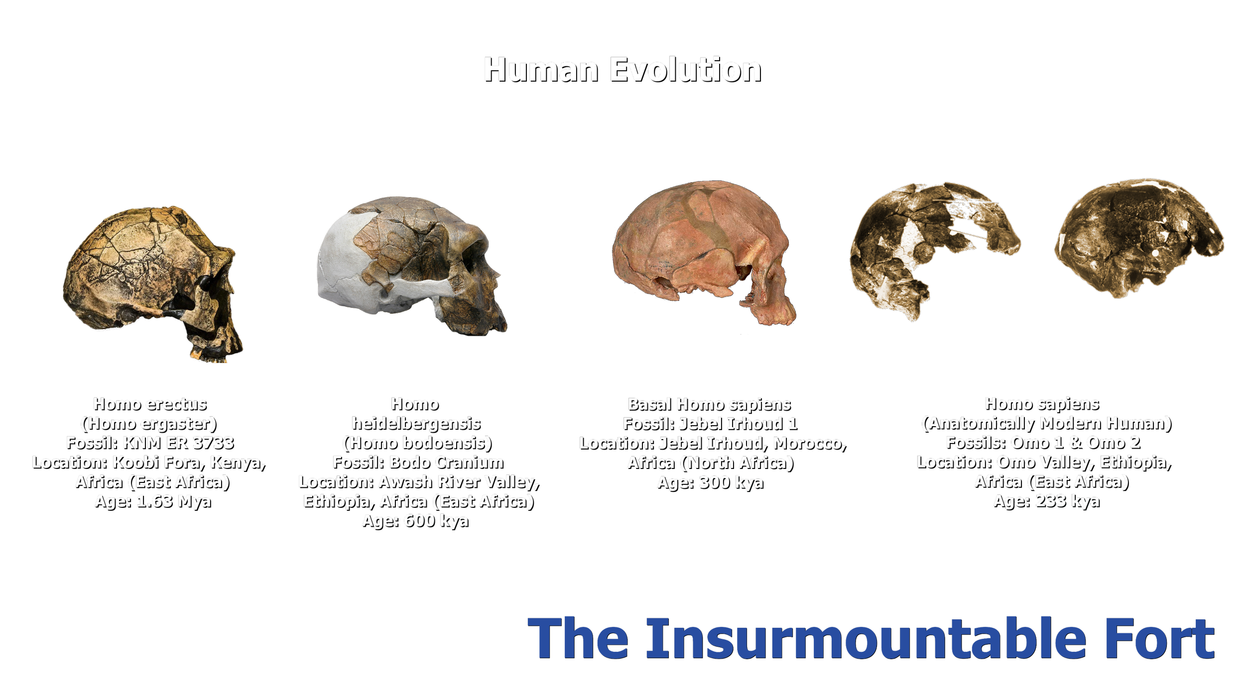 Note that all of these fossils - except for Jebel Irhoud 1 - were discovered in East Africa. This indicates that East Africa is where the lineage that produced Homo sapiens evolved and that the Jebel Irhoud humans were migrants from East Africa.